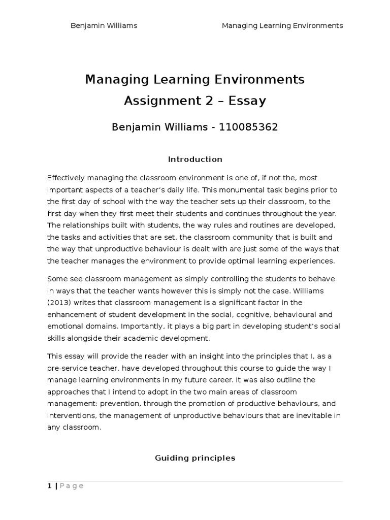 Good Essays Words 6 Pages Open Document Classroom management is a key element to establish a successful learning environment in any classroom. An effective classroom management plan creates a positive learning environment. Classroom management is affected by the characteristics of the students and their behavior Classroom management refers to “the wide variety of skills and techniques that teachers use to keep students organized, orderly, focused, attentive, on task, and academically productive during a class”. Therefore, without good classroom management the classroom will not be an environment of learning, rather it will be an environment of chaos · classroom management is often viewed as a continuous process that requires adequate patience and effective planning and as stated by larrivee (), ‘classroom management is a critical ingredient in a three-way mix of effective teaching strategies, which includes meaningful content, powerful teaching strategies and an organisational structure