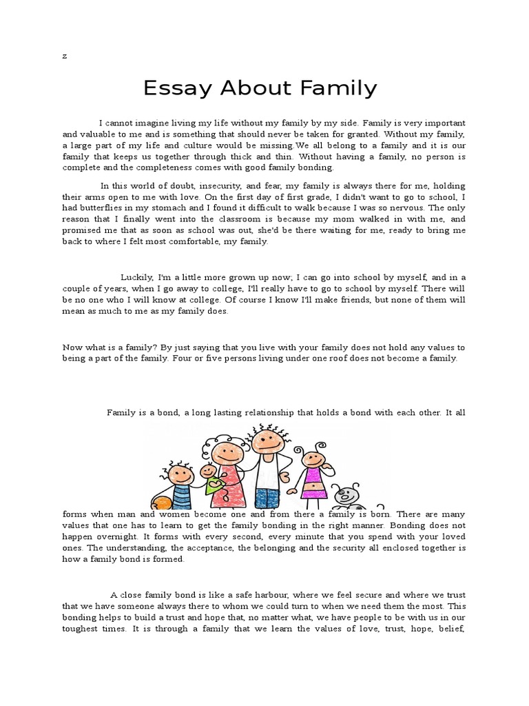 · A family essay body is where you present the main ideas and arguments in a logical sequence. The conclusion should be the last part you write, so you don’t need to plan it along with the other two components. After writing the outline, go through each point again to see if they link together nicely Family is very important and valuable to me and is something that should never be taken for granted. Without my family, a large part of my life and culture would be missing. Whether it's my grandparent, my two sisters, my mom, or my dad, I know Family is always by your side when you need them. People hear family and think about parents, I hear family and think about my parents, aunts, cousins, friends, and my karate family. They are all so important to me and I don’t know what I would do without them. On the other hand, Romeo and Juliet displayed family in an interesting way